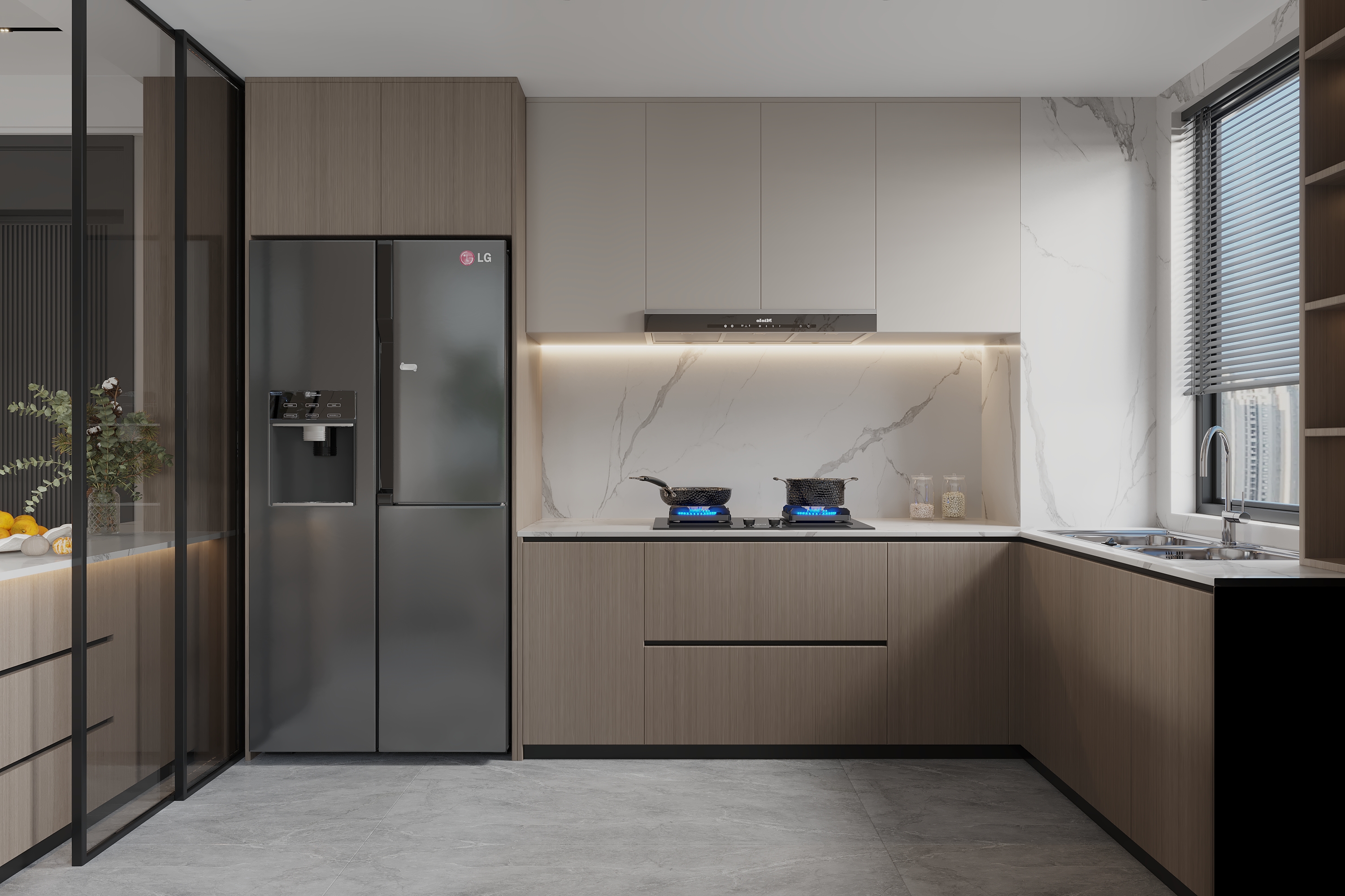 - 🪵 Material Restraint|Balancing matte gray cabinetry, warm wood tones, and stone details, creating subtle contrast with clear layers.